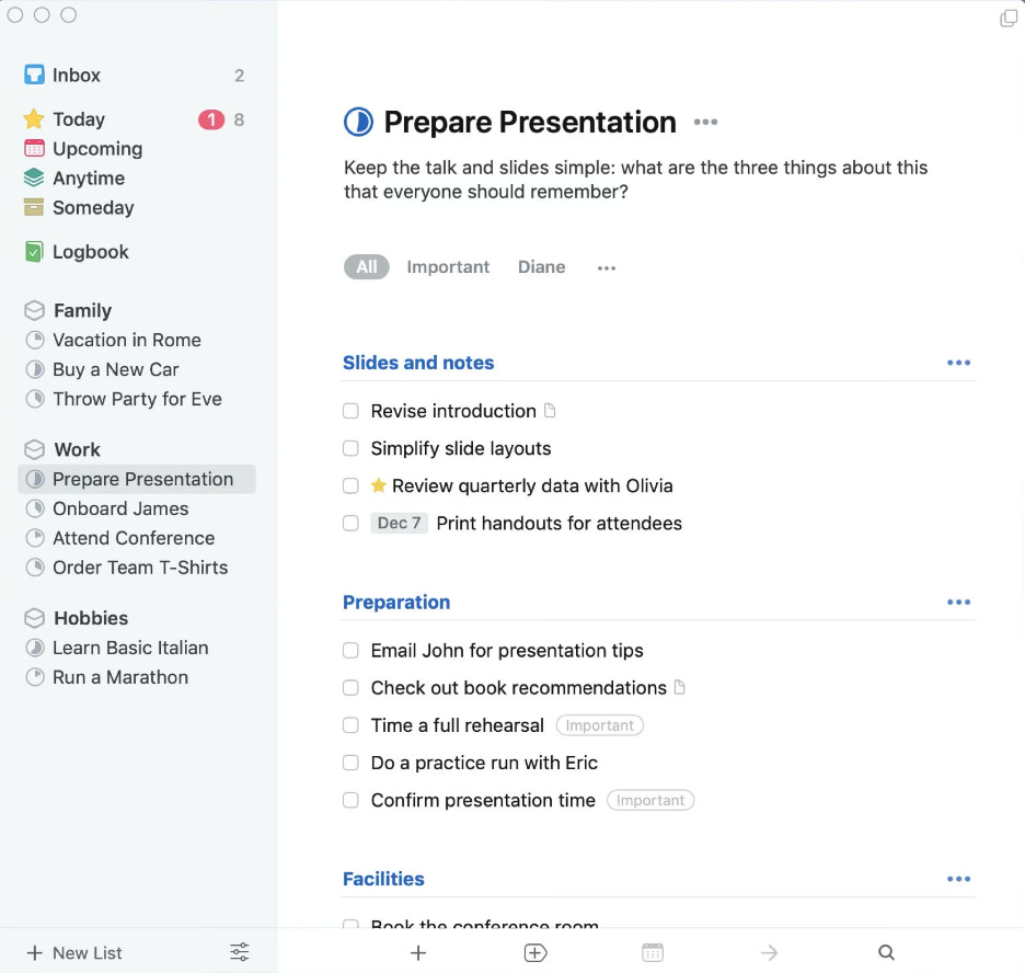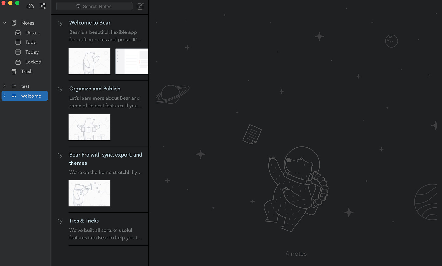 Bear App on the Mac. It has clean font and spacing. The outlined illustrations are meticulously designed with a two-tone effect. The empty states are beautiful to look at and the whole interface is uncluttered