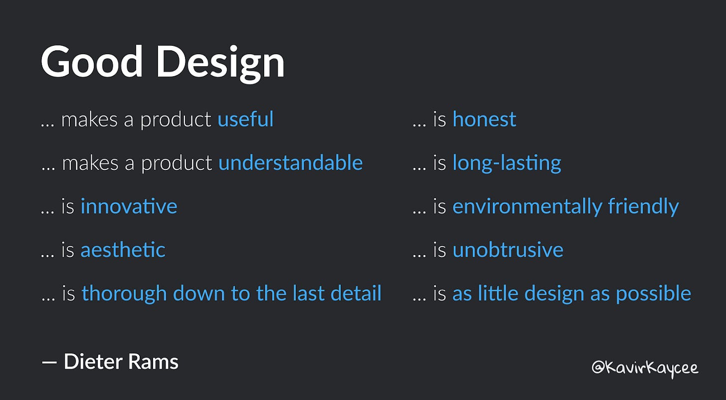 Good design is as little design as possible. It's oftentimes invisible. You should avoid cluttering in the interfaces to reduce cognitive load. Less, but better.
