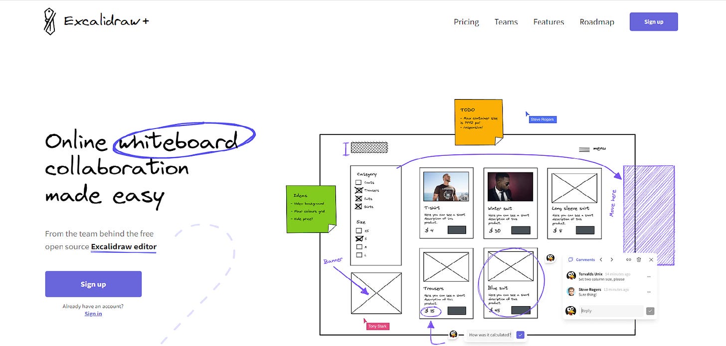 Excalidraw is a free, open-source tool that can help you make simple drawings very easily. The best feature is that it has keyboard shortcuts that make whiteboarding seamless.